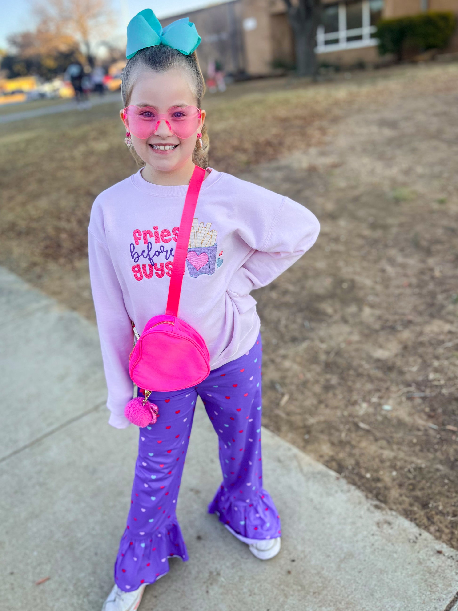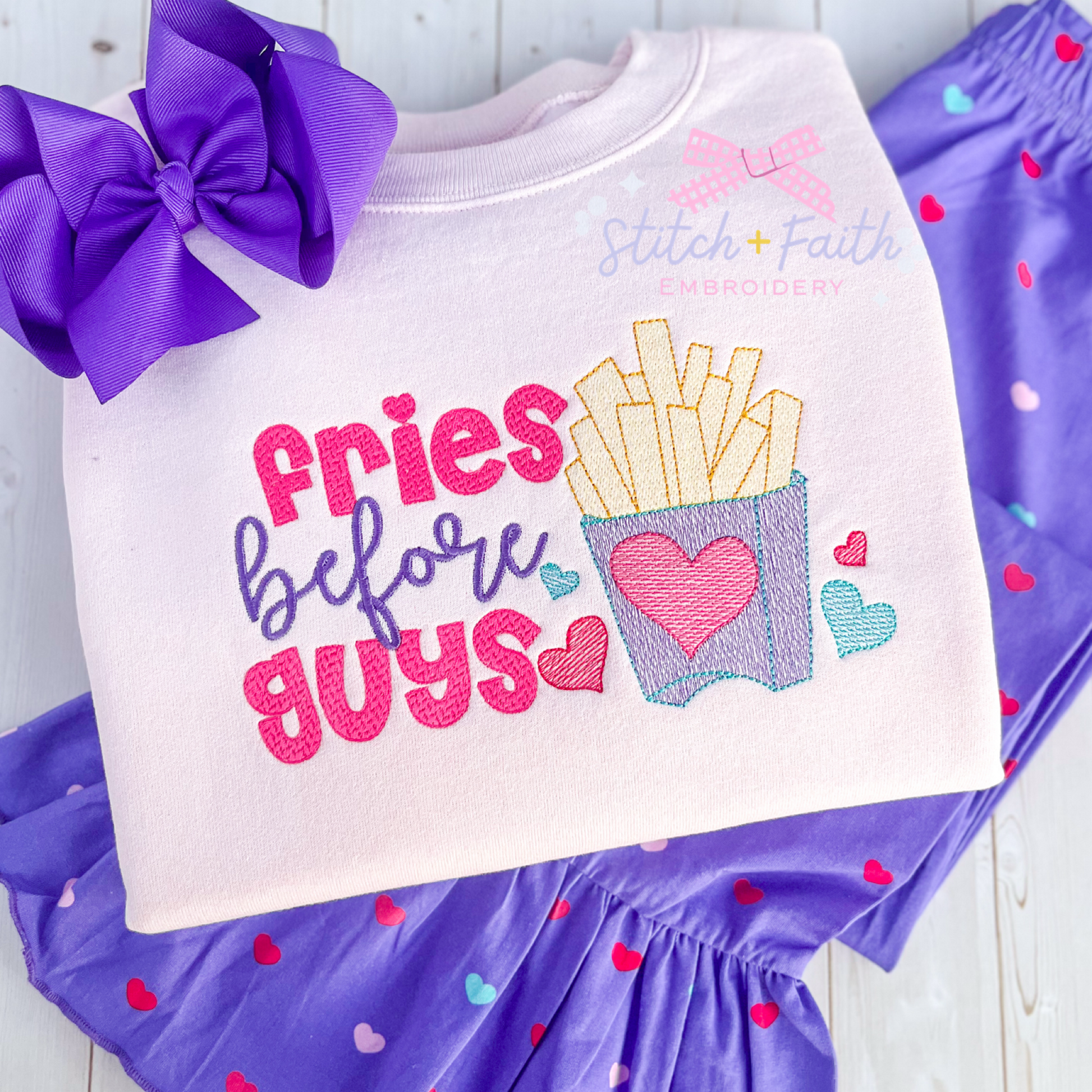 This soft pink sweatshirt features embroidered “fries before guys” lettering. Perfect for a fry diva daughter, this piece is comfortable for everyday wear and makes a thoughtful gift full of and love.