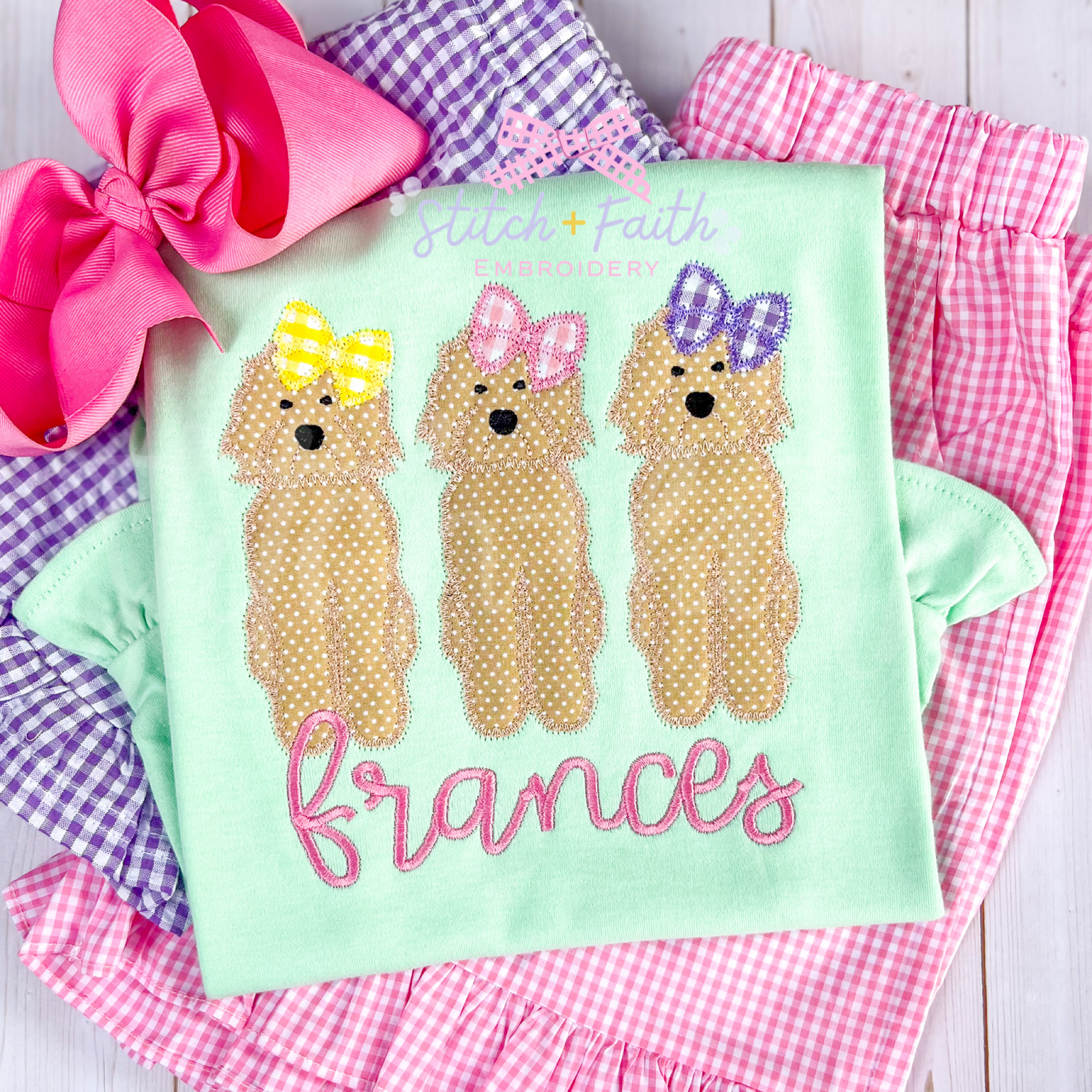 This adorable ruffle shirt is perfect for little Doodle lovers! Featuring a playful embroidered Appliqué lineup of the sweetest trio of Doodles. Finished with your child’s name stitched below the design, it’s a fun and personalized piece she’ll love to wear.